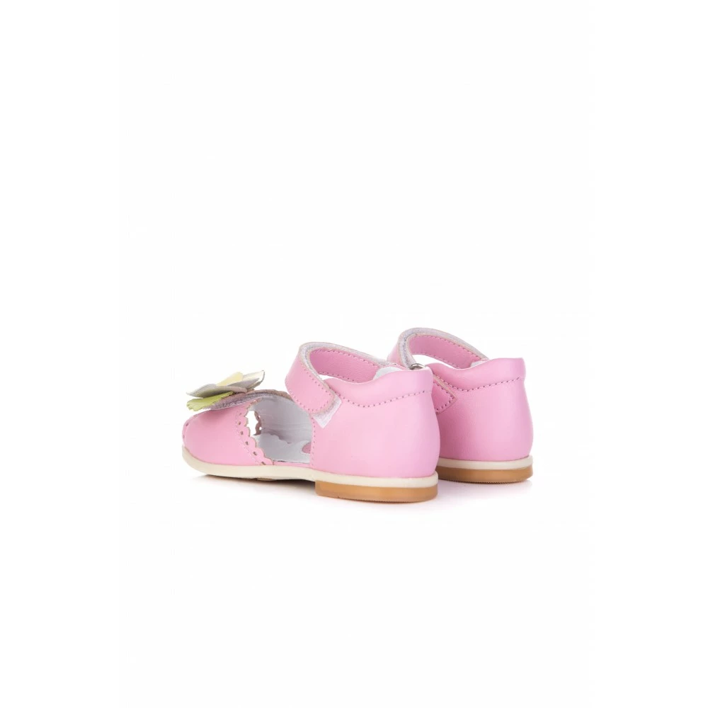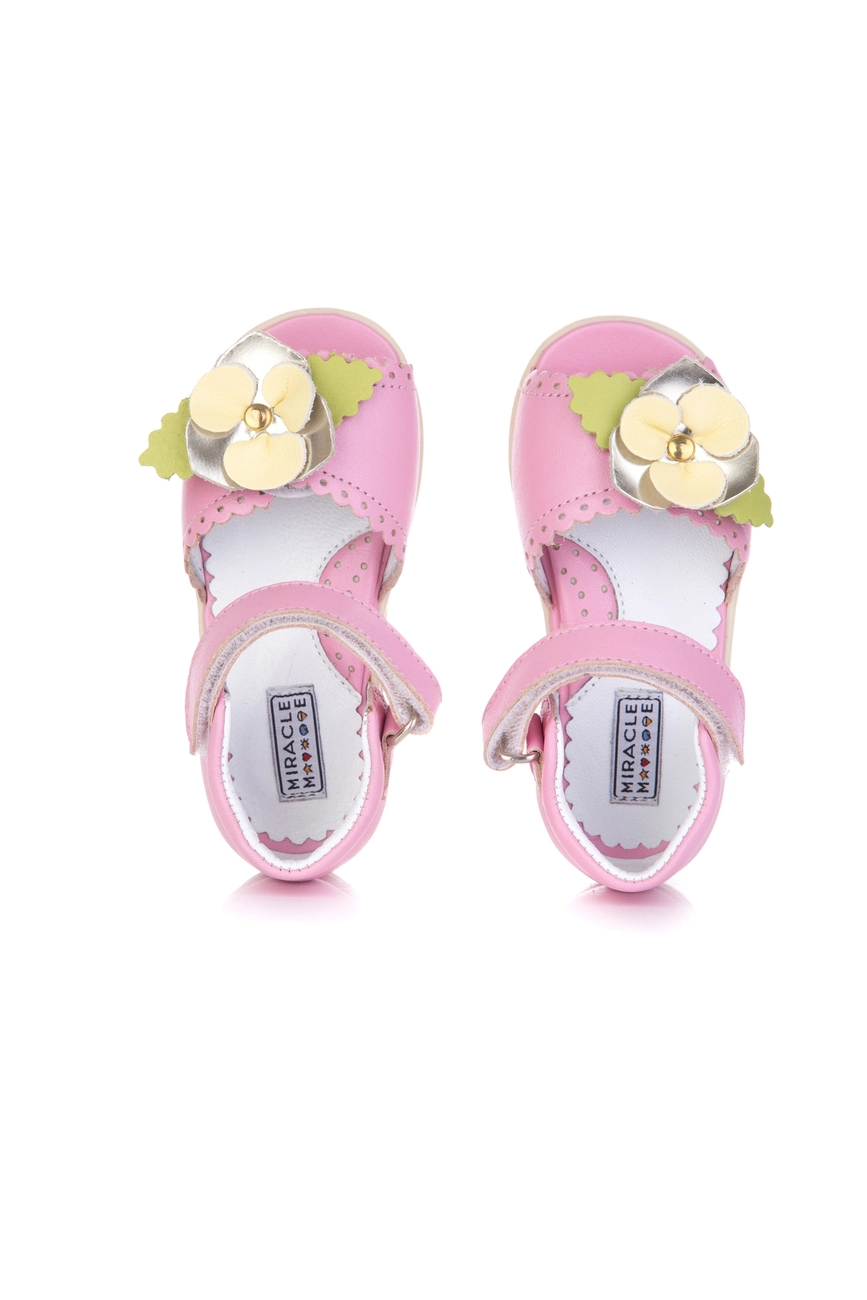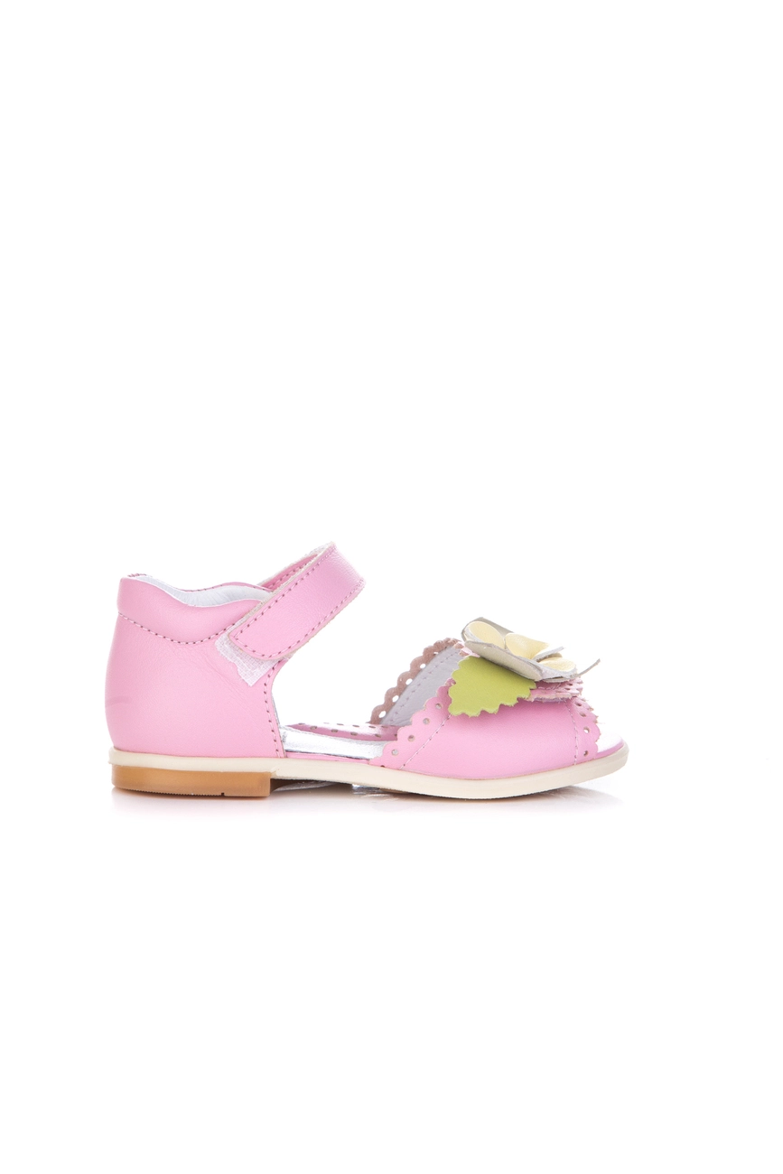 Такой вариант обуви понравиться любой моднице. Данная модель обладает красивым розовым цветом в сочетании с зелёными лепестками и жёлтым цветком. Прочный задник и надёжно зафиксированный передник позволяет избежать формирования плоскостопия у девочки и обеспечивая правильное развитие ноги.