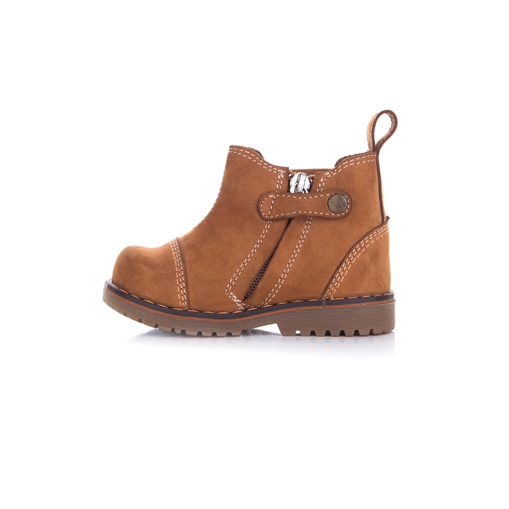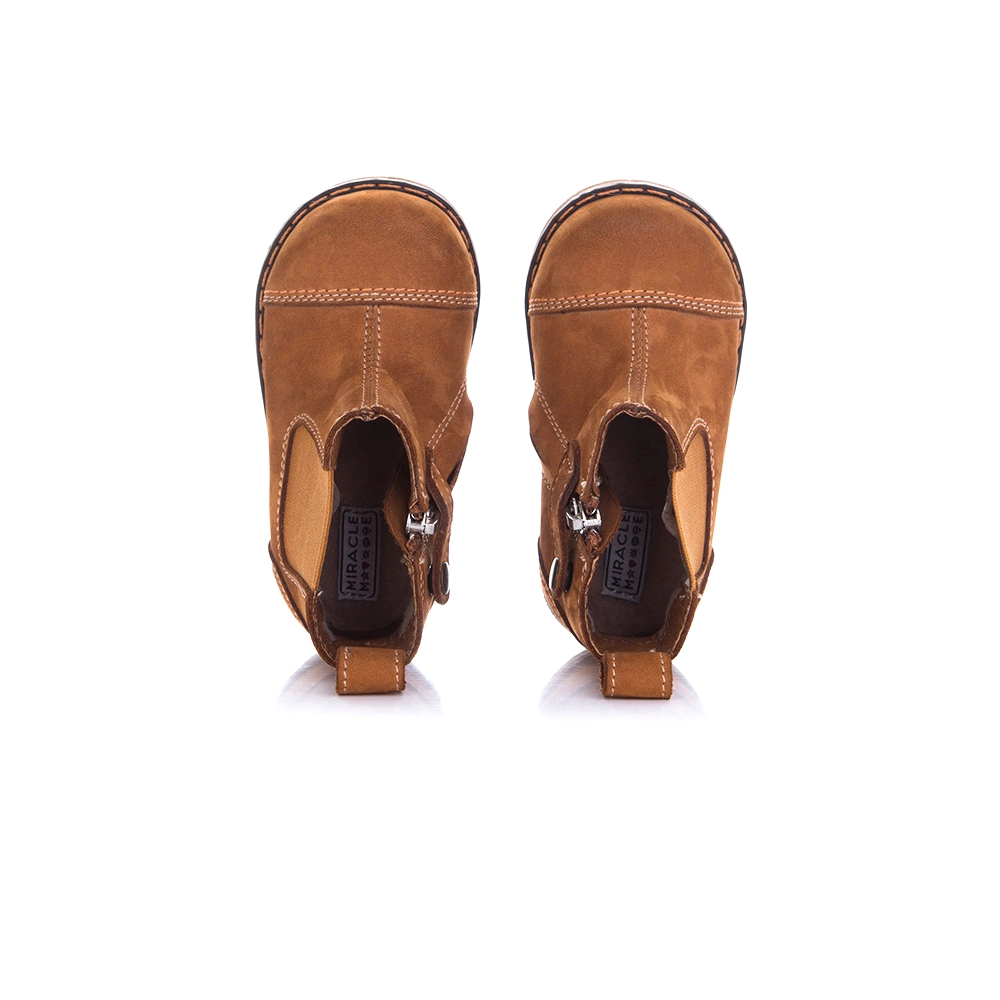 Бежевые ботинки от компании Miracle Me возможно приобрести, если вы желаете побеспокоиться о собственном ребёнке и купить не только стильную, но и качественную обувь. Такой вариант из натуральной кожи-нубук, позволит удобно носить благодаря резинке и отсутствию молний на обуви.